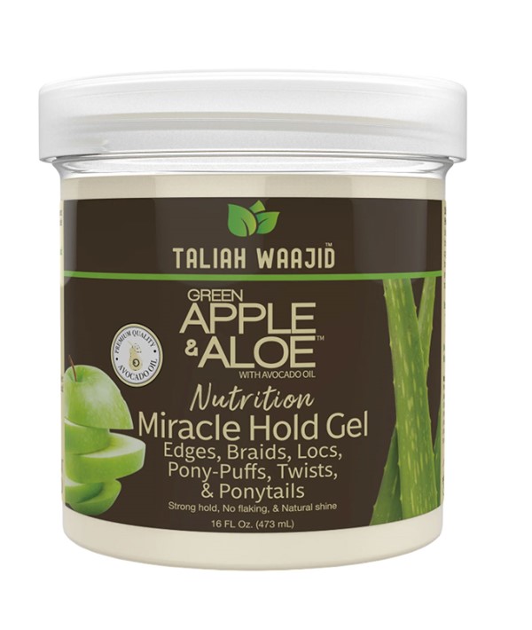Green Apple & Aloe Nutrition Miracle Hold Gel by Taliah Waajid™ is a multi-use styler. It provides superior all-day hold, without leaving your hair feeling hard or crunchy, and without flaking. It’s ideal for styling ponytails, pony-puffs, braids, locs, twists, edges, and more!