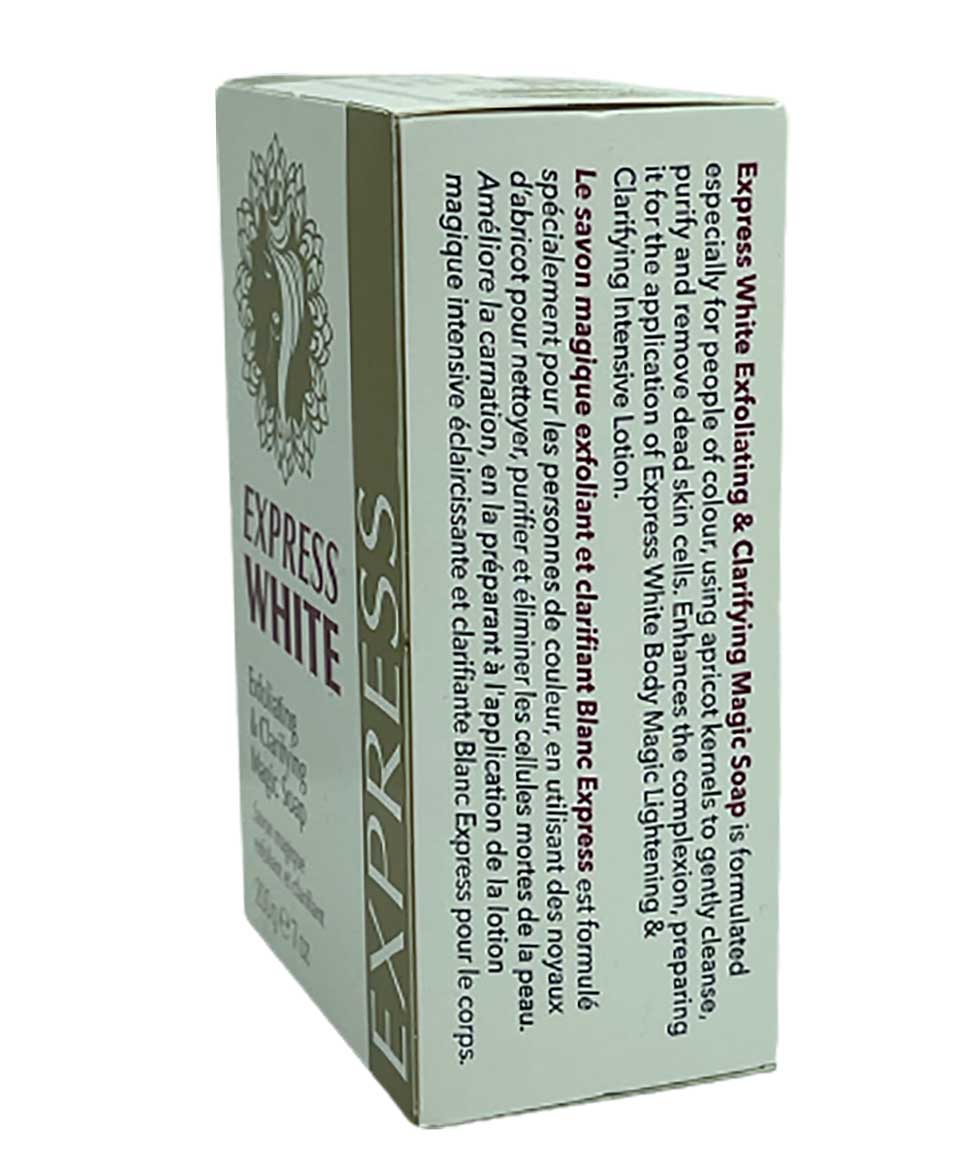 Express White Exfoliating & Clarifying Magic Soap is formulated especially for people of color, using apricot kernels to gently cleanse, purify and remove dead skin cells. Enhances the complexion, preparing it for the application of Express White Body Magic Lightening & Clarifying Intensive Lotion.