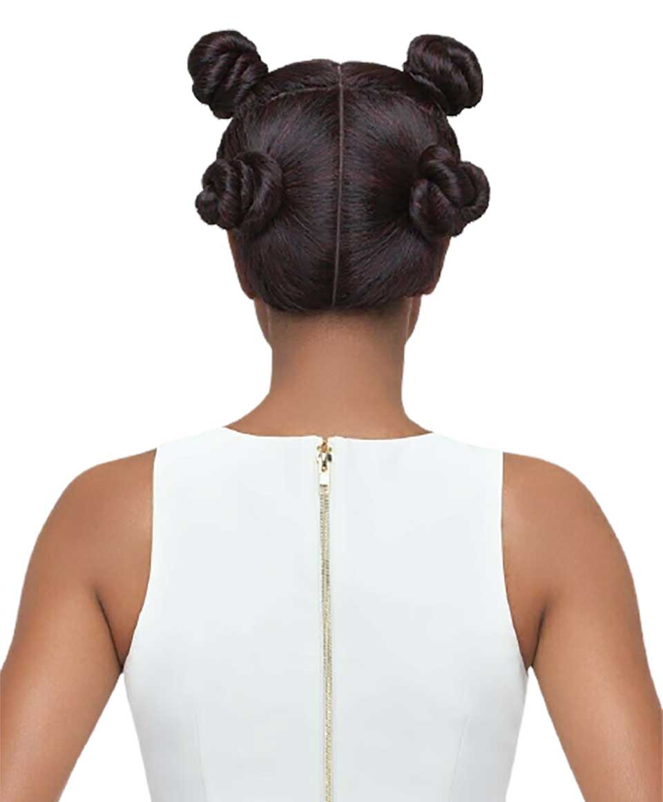Smooth and sleek blowout style with Vixen cap. With this cap, the styling possibilities are endless: you can part your hair in 4 ways! French plaits, ponytails, space buns, half updos - you name it. 22" of lush soft heat resistant synthetic hair - all yours. Pre-plucked Swiss lace and baby hairs allow you to reveal your hairline for a natural and realistic look. Transform your look over and over again. Now that's hair goals! .