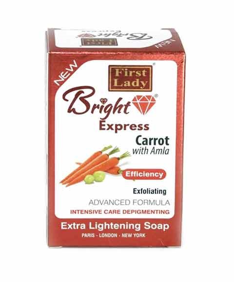 Firstlady Bright Express Carrot With Amla Extra Lightening Soap has been developed for black and combined mix skin. This soap is rich in carrot seed oil, which is beneficial in lightening the skin tone and to even patchy blemished skin. Carrot Seed Oil = Naturally reduces melanin. Amla Oil = Reduces pigmentation (dark spots) on the skin and assists in restoring the skins natural glow