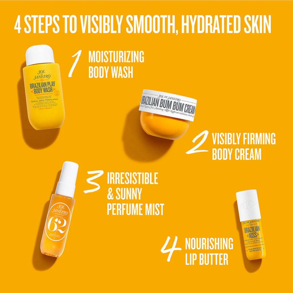 The Sol de Janeiro Smooth & Glow set transforms your daily beauty ritual into a sensorial escape.Start with the creamy Brazilian 4 Play Shower Cream-Gel to cleanse, then smooth on the Brazilian Bum Bum Cream to help skin feel soft and nourished. A spritz of Cheirosa 62 Perfume Mist is enriched with the iconic blend of pistachio, salted caramel and vanilla, while the Brazilian Kiss Cupuaçu Lip Butter softens lips with a burst of tropical hydration and shine.