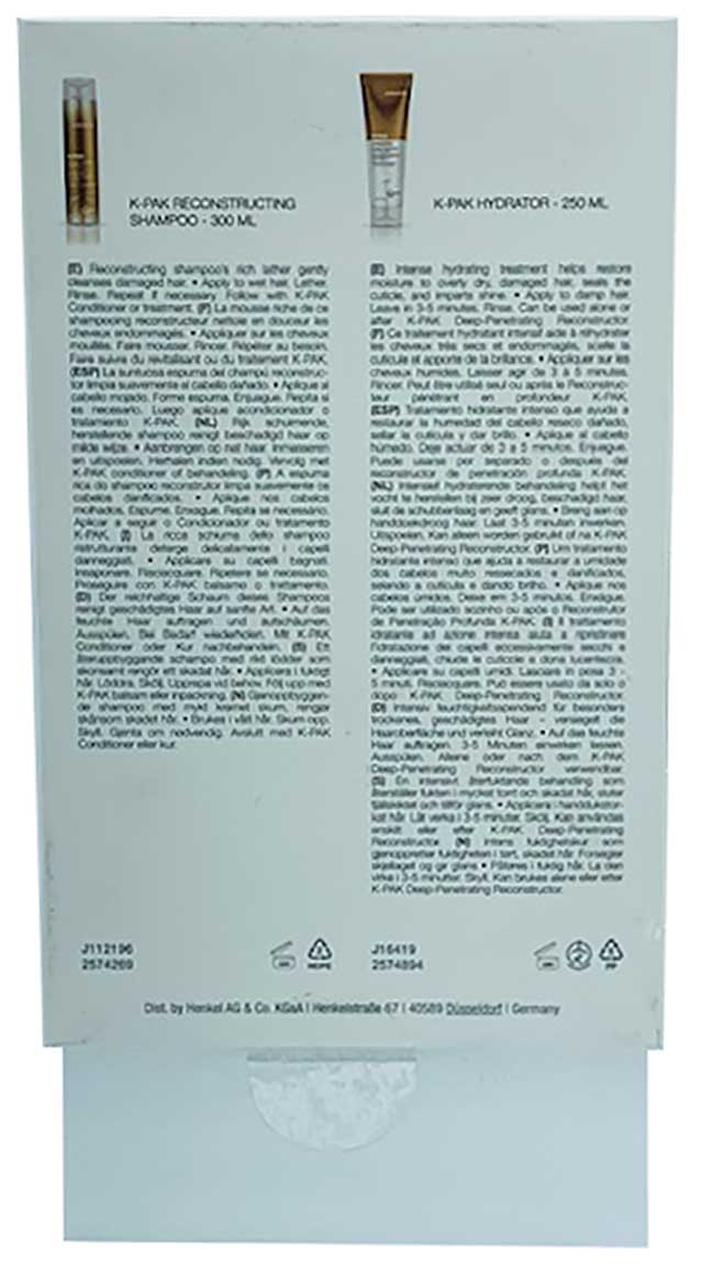 K Pak Reconstructing Shampoo And Hydrator Gift Set,is reconstructing shampoo rich lather gently cleanses damaged hair. Apply to wet hair. Lather. Rinse. Repeat if necessary. Flow with k-pak conditioner or treatment. Intense Hydrating treatment helps restore moisture to overly dry, damaged hair, seals the cuticle, and imparts shine. Apply to damp hair. Leave in 3-5 minutes. Rinse. Can be used alone or after k-pak deep penetrating reconstructor.