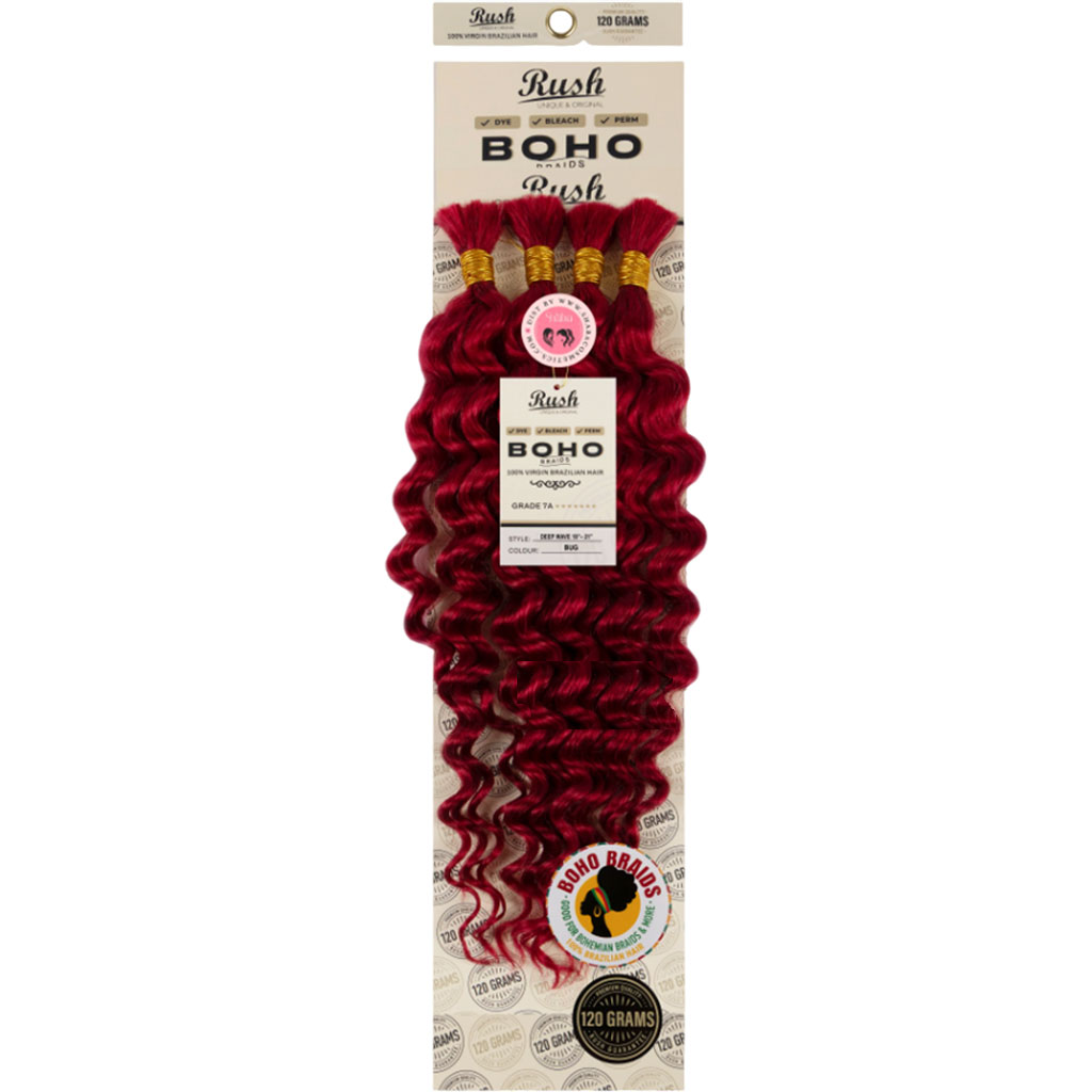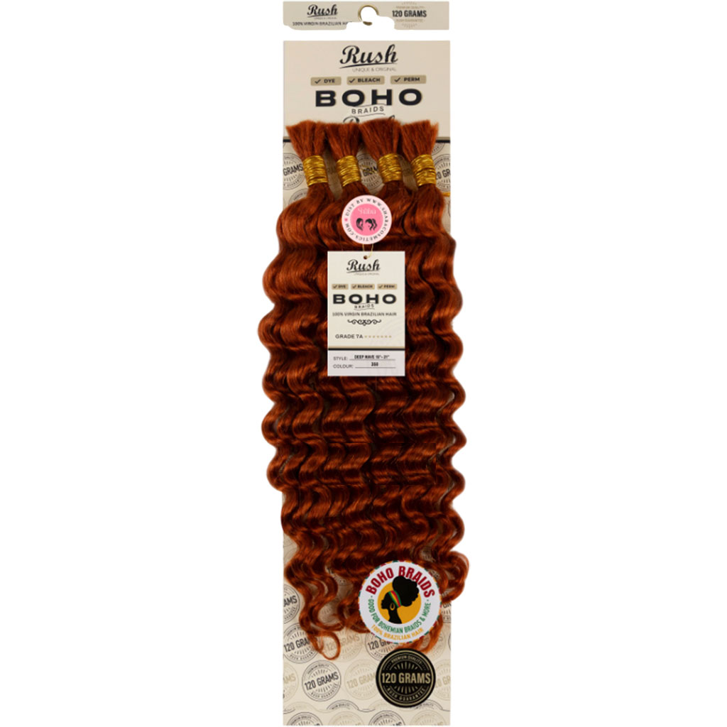 RUSH 100% Virgin Brazilian Boho Braids in Deep Wave texture are crafted from premium, ethically sourced virgin Brazilian hair, offering rich texture, softness, and lasting elegance. The deep wave pattern delivers beautifully defined curls with natural bounce and volume, creating a bold yet refined boho look. This premium bulk hair is ideal for boho braids, knotless braids, and customized protective styles, providing a seamless, natural blend.