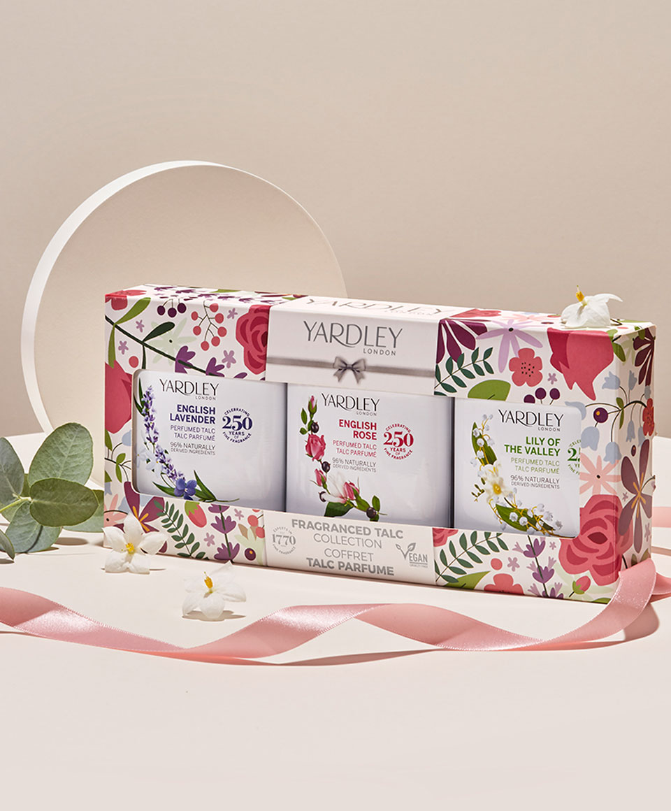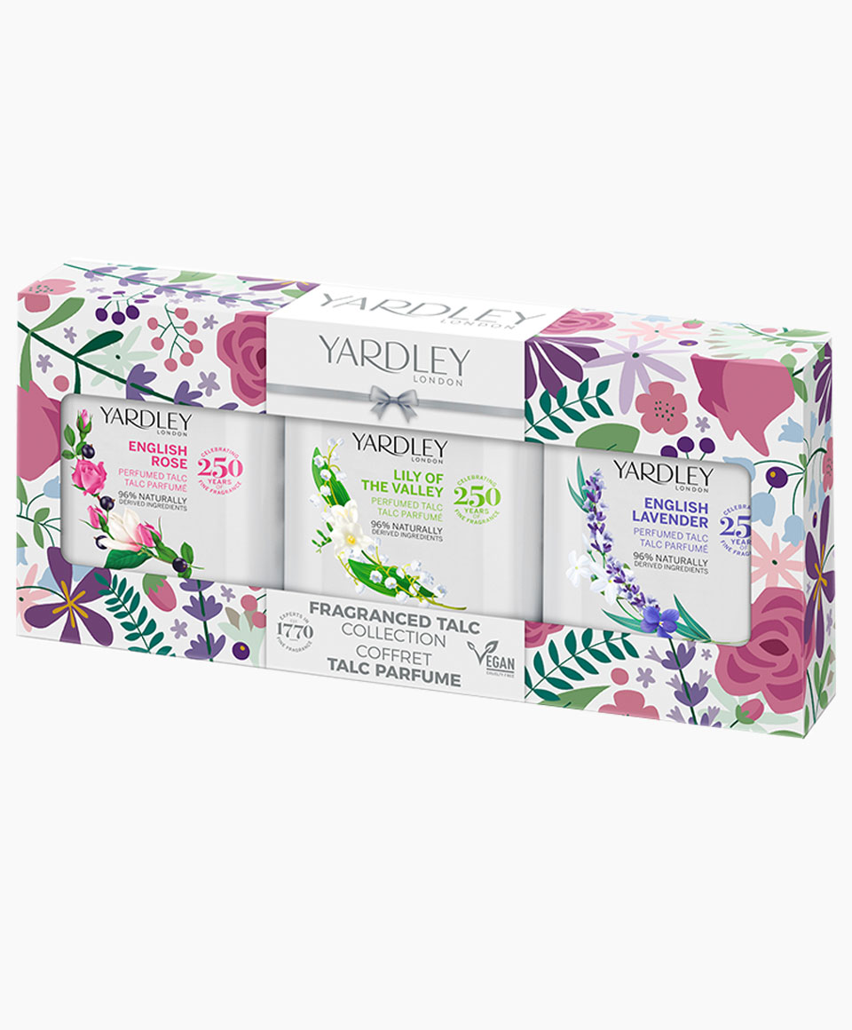 A fragranced mini collection for her of luxurious perfumed Talcs, ideal for travel or the gym, in three Yardley London Traditional Floral fragrances - English Lavender, English Rose and Lily of the Valley. Designed to leave skin feeling silky soft and delicately fragranced, best applied after bathing or showering. Contains up to 96% naturally derived ingredients. Vegan & cruelty free. Paraben free. Plastic free gift box.