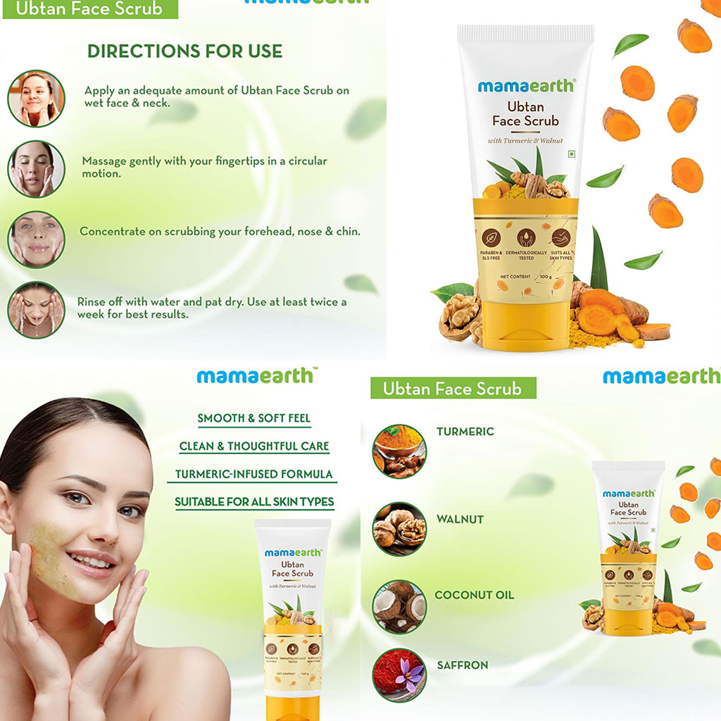 Mamaearth Turmeric and Walnut Ubtan Face Scrub is a gentle yet effective solution for skin damaged by pollution, dirt, harmful UV rays and harsh weather conditions. The scrub is enriched with the natural goodness of turmeric and walnut, which work together to protect the skin from free radical damage, fight sun tan, lighten skin tone and gently exfoliate to reveal fresh and healthy skin. This scrub is suitable for all skin types and has been dermatologically tested. Moreover, it does not contain any harmful chemicals, making it a safe and reliable option for your skincare routine.