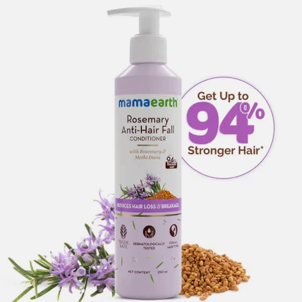 Stressed about hair breakage & hair loss? We’ve got your back. Meet Mamaearth Rosemary Anti-Hair Fall Conditioner that gives you up to 94% stronger hair* and results in up to 93% less hair fall*. Crafted with the natural goodness of Rosemary and Methi Dana, it deeply conditions and strengthens your hair while preventing hair breakage. Rosemary penetrates deep into the hair shaft and seals in moisture while Methi Dana replenishes weakened hair strands with antioxidants, proteins and vital nutrients, strengthening and nourishing them.