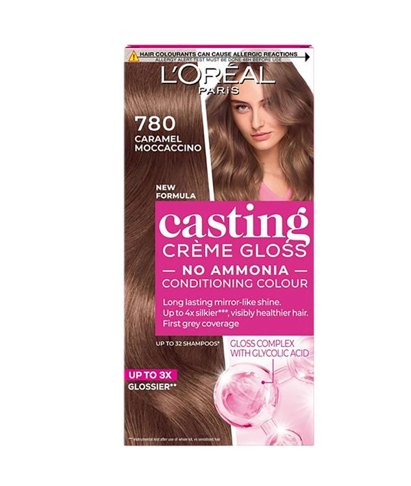 Casting Creme Gloss Conditioning Colour Caramel Moccaccino . L'Oreal Paris Castingcreme Gloss Caramel Moccacino 780 illuminates hair with shimmering tones. Super soft, super glossy hair colour and no ammonia and lasts up to 28 washes.Conditioning colour - without ammonia, with visible shimmering tones, blends away grey .Super soft, super glossy with gorgeous shimmering tones .