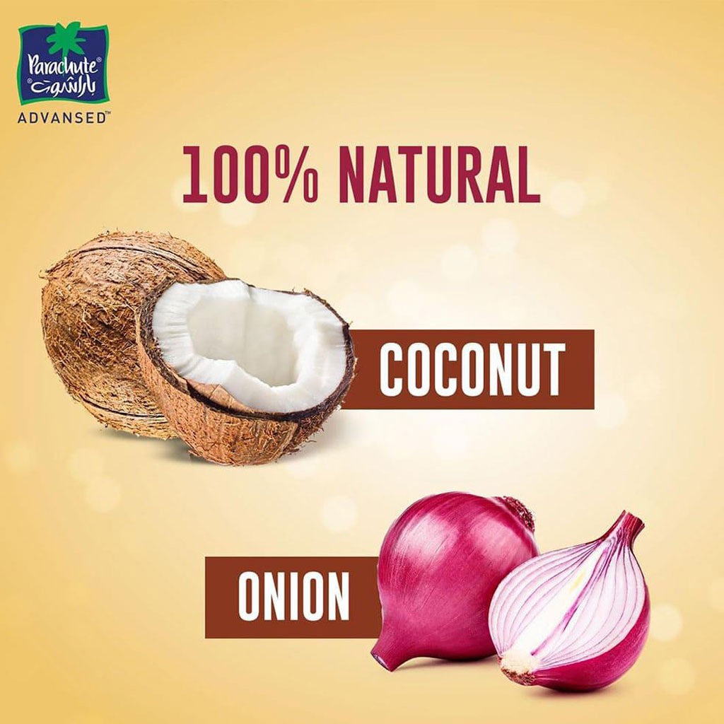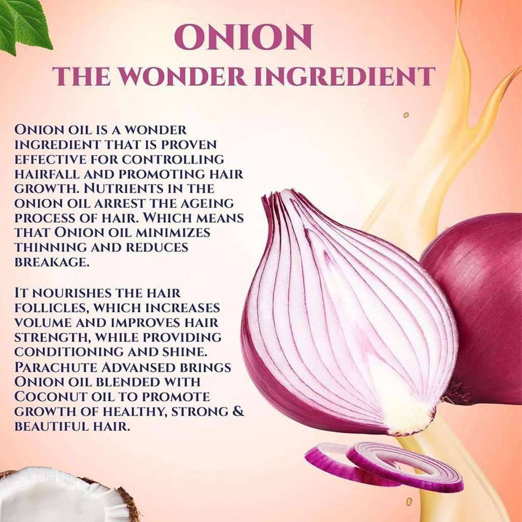 Deep Nourishment for Strong & Healthy Hair – Natural Shine & Enhanced Volume! Indulge your hair in complete nourishment with Parachute Coconut Oil enriched with Onion, combining the moisturizing benefits of coconut oil with the strengthening properties of onion oil!
