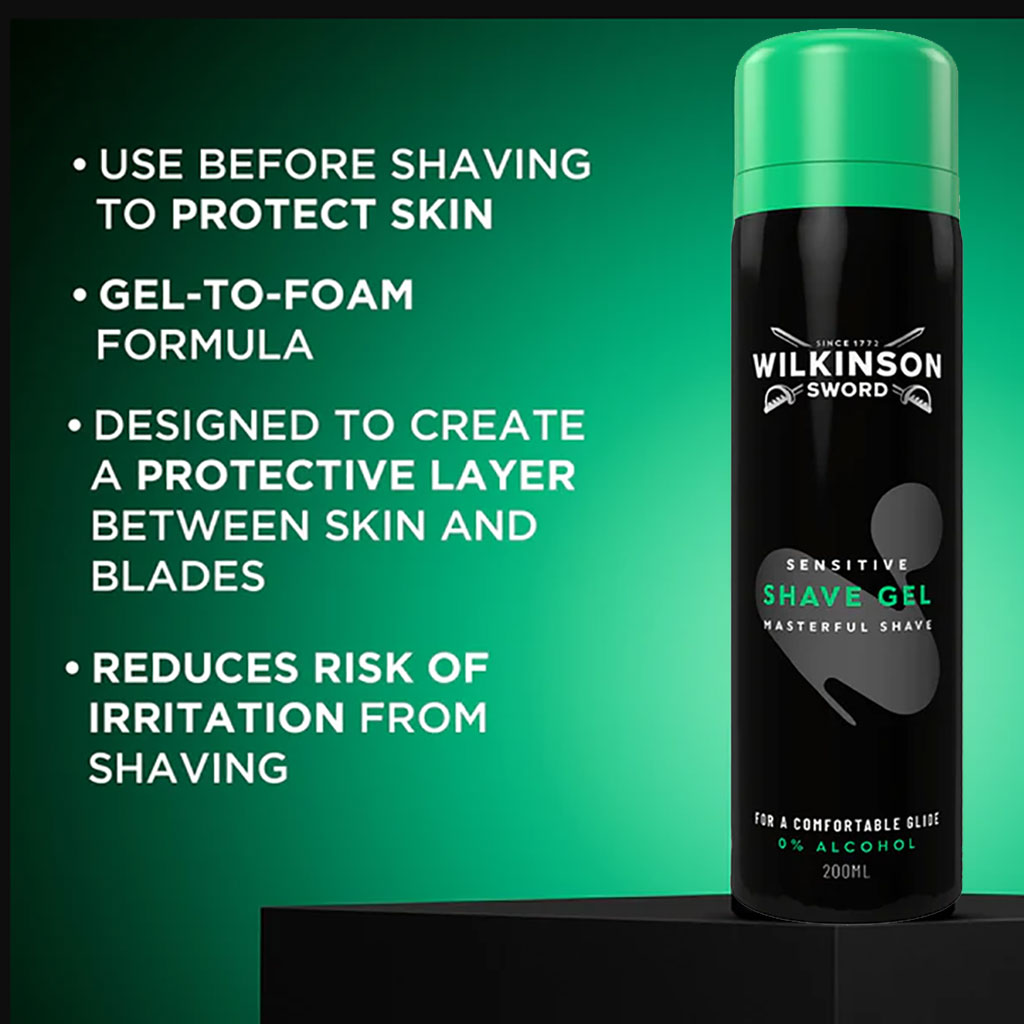 Experience a masterful shave with the Sensitive Shave Gel for men from Wilkinson Sword. Our shaving gel-to-foam formula is designed to create a thin protective layer on the skin for a precise and more comfortable shave.