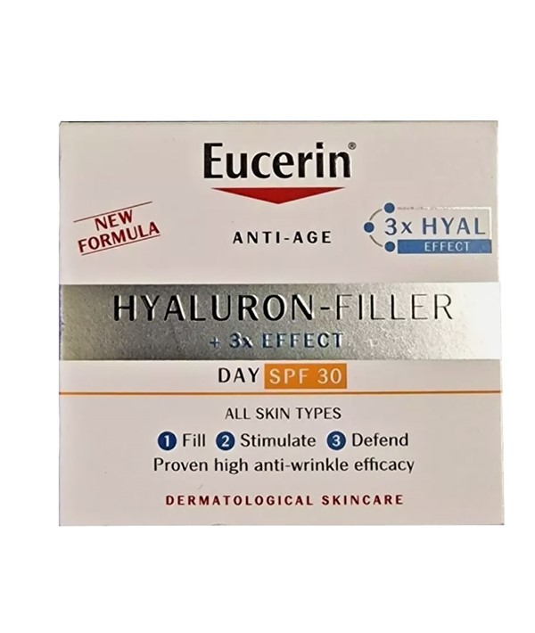Eucerin Hyaluron-Filler Day Cream for all skin types is an anti-ageing day cream with SPF30 and UVA protection that helps plump up the skins appearance, and visibly reduce signs of ageing including deeper wrinkles.Eucerin Hyaluron-Filler Day SPF 30 with 3x Effect formula counteracts this process.
