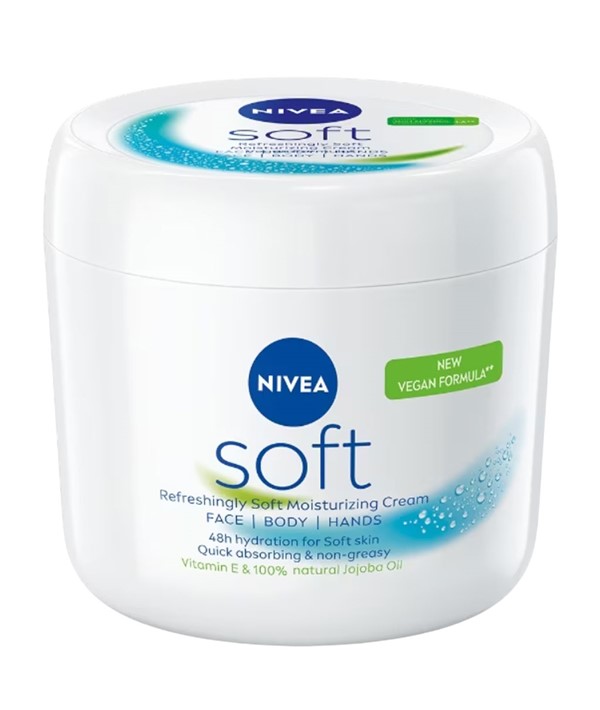 NIVEA® Soft is a highly effective moisturising cream, providing an invigorating and refreshing feeling for everyday use. The light formula with Vitamin E & 100% natural Jojoba oil provides 48h hydration for soft skin, with quickly absorption and non-greasy feeling. It now also contains 95% naturally derived ingredients and is completely vegan. Skin compatibility dermatologically approved. Ingredients are from nature retain +50% of their natural state after being processed, including water. Moisturising Fast absorbing Refreshing Jojoba Oil All skin types