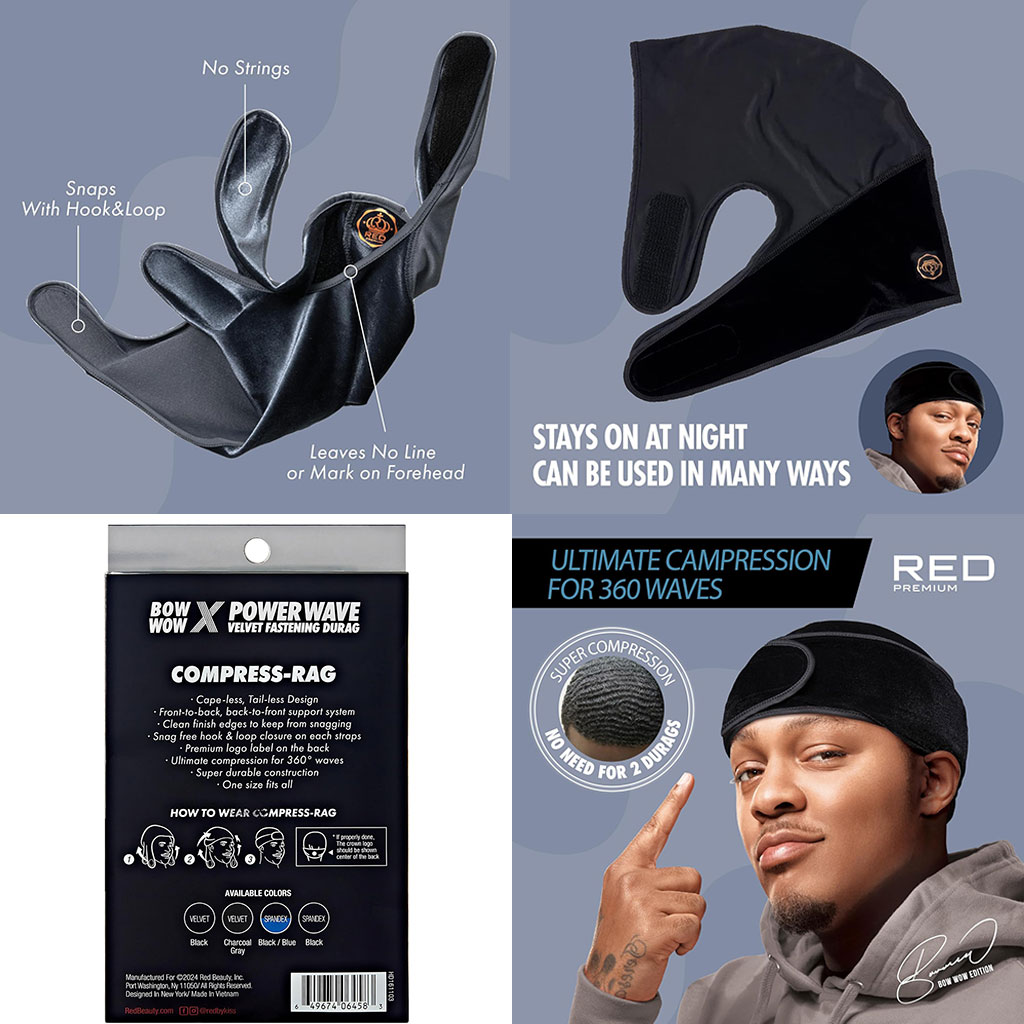 A unique design that allows for easy and comfortable use, the Red Premium Bow Wow Power Wave Compression Durag is cape-less, tail-less, and uses a front to back, back to front support system that features a hook-and-loop fastener strap.