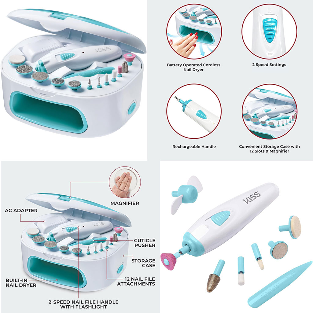 • Nail kit includes battery operated handle, cone-shaped file, pointed detail file, precision tool, polishing disc, fine and coarse grit discs, drying fan & cuticle pusher .