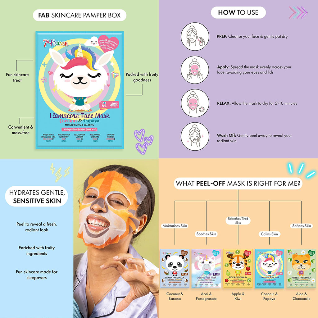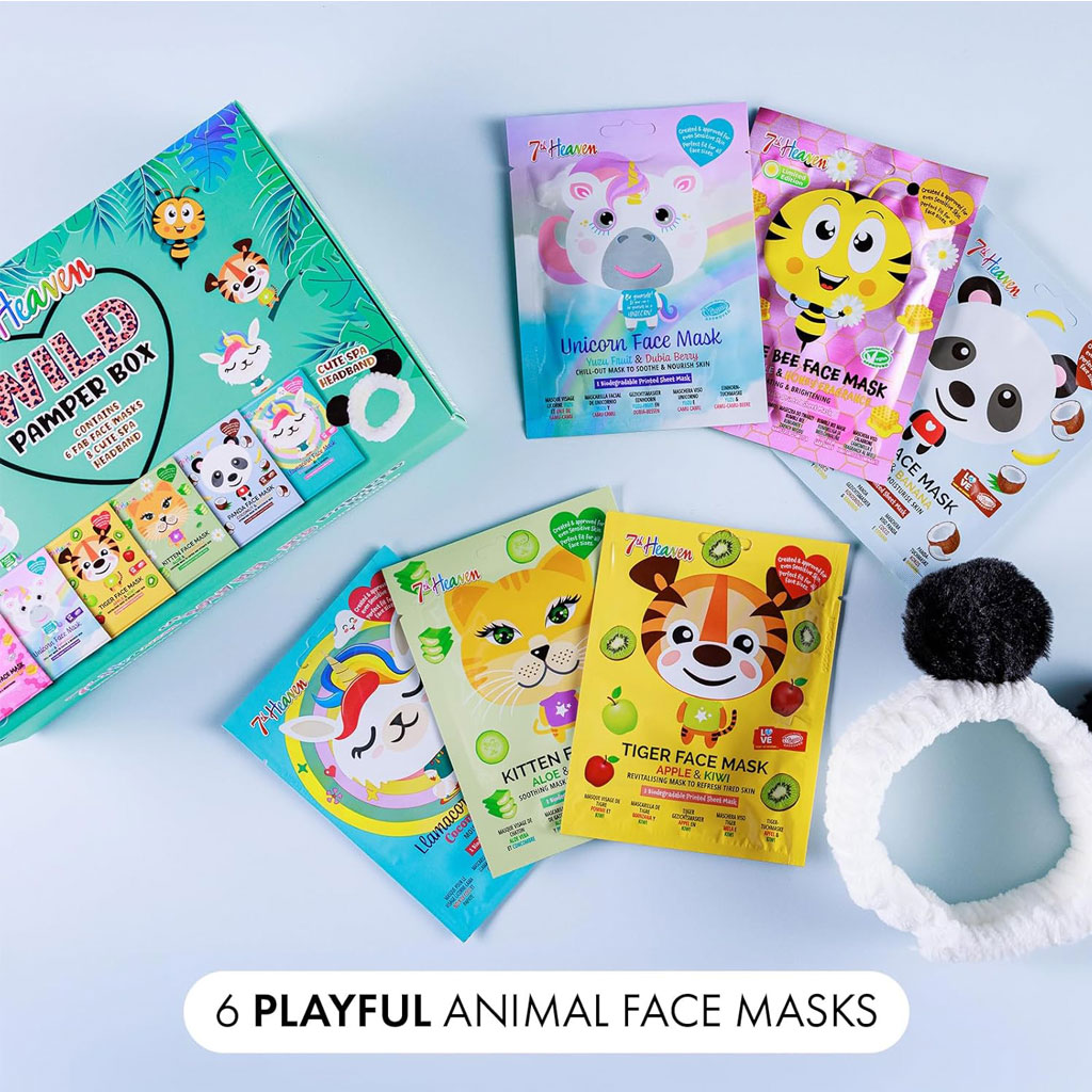 Unleash your wild side with 7th Heaven face masks and treat your skin. These playful, animal-printed sheet masks for children are packed with a blend of fruity ingredients to soothe, hydrate and moisturise.