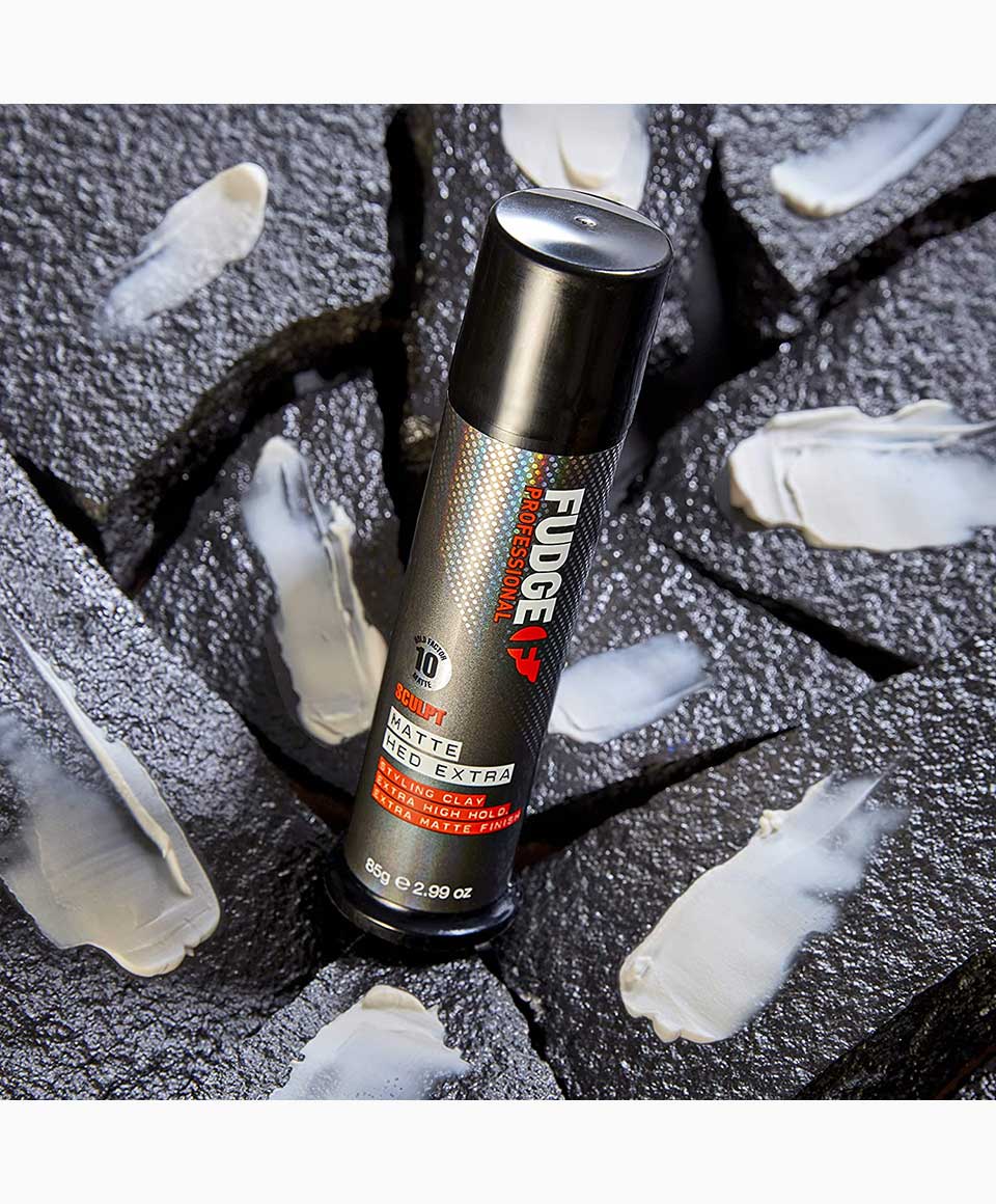 Fudge Matte Hed Extra offers superior longevity of style and creates a manageable, natural and texturized finish. A combination of kaolin and bentonite clay absorbs moisture and coats the hair for an extra dry, matte finish. Cationic polymers provide maximum hold to preserve hairstyles even in high levels of humidity. Beeswax delivers a smooth creamy texture, making the product smooth and easy to apply. The practical dispenser helps with the correct dosage. Fudge Matte Hed Extra has a hold level of 10.