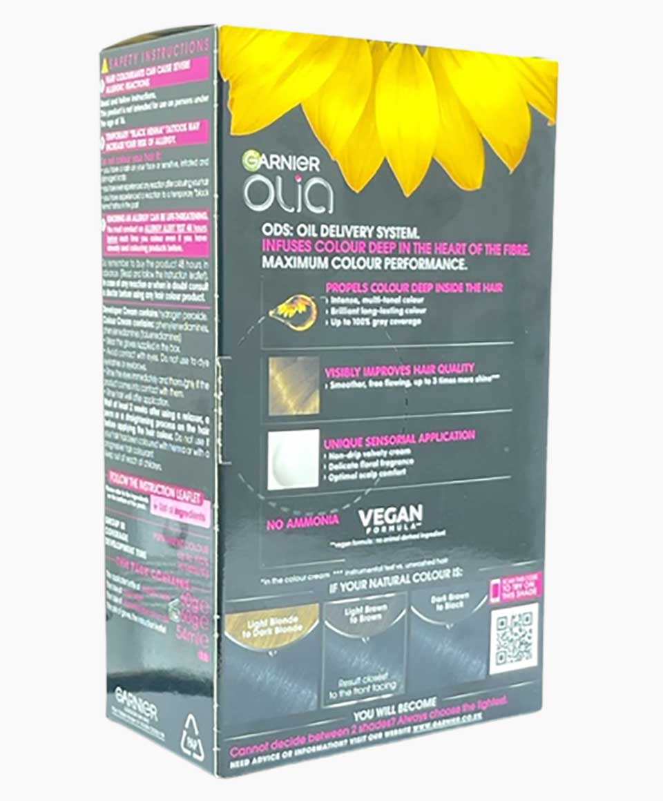 Garnier Olia Permanent Colour With Natural Origin Flower Seed Oils gives maximum colour performance. Up to 100% grey coverage, Intense, long-lasting colour, visibly improves hair quality, optimal scalp comfort. Vegan formula.