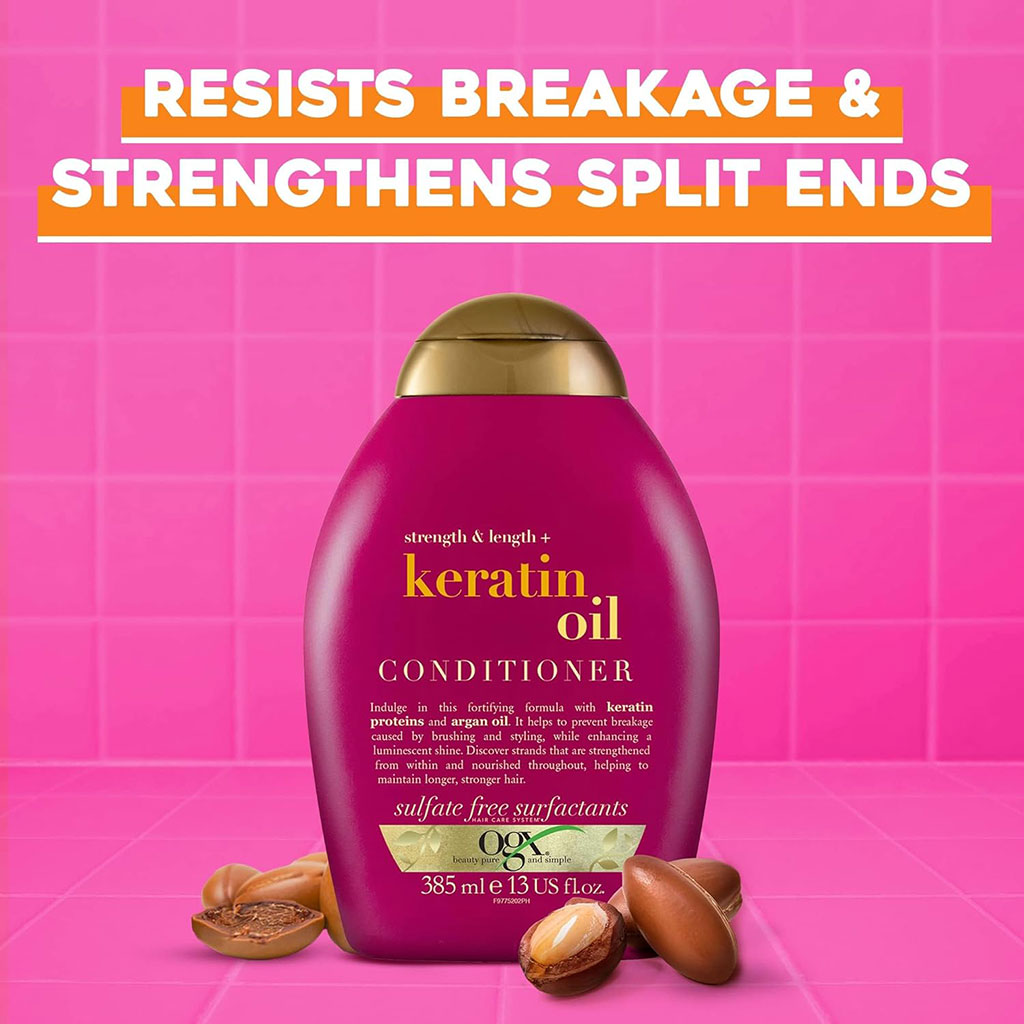Ogx Anti Breakage Keratin Oil Conditioner. Strength is beautiful, specially strong, sexy strands! Defend against split ends and fly-a-ways. Rid your mane of all those pesky broken hair pieces! Stronger hair can grow longer and more beautiful. is a strengthening and nourishing conditioner crafted to reduce breakage, improve elasticity, and add shine to hair prone to damage or split ends. Infused with keratin proteins and argan oil, this conditioner works to fortify each strand, leaving hair feeling soft, resilient, and healthier. It’s ideal for anyone dealing with fragile, damaged, or chemically treated hair looking to enhance strength and reduce breakage.
