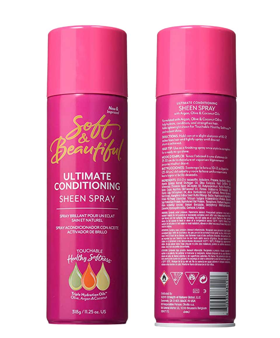 Infused with jojoba and almond oils to silken, nourish, and strengthen hair, Soft & Beautiful Ultimate Conditioning Sheen Spray adds weightless sheen for shiny, touchable, soft hair .