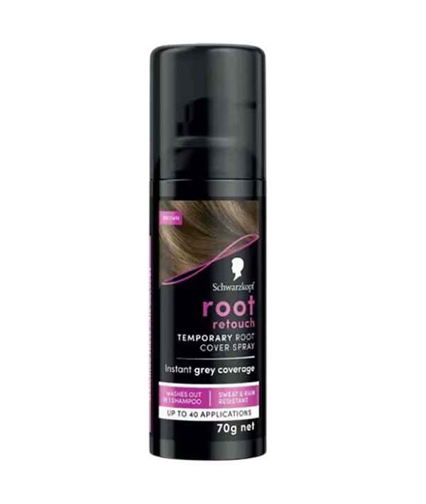 Temporary root cover spray that instantly covers lighter and grey regrowth in a few seconds. .