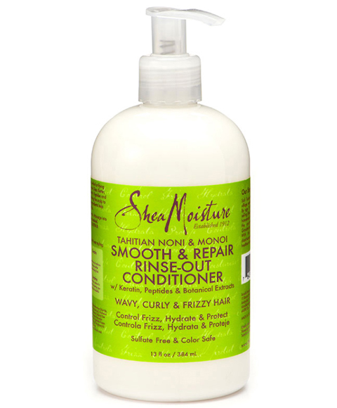 Shea Moisture Smooth and Repair Rinse Out Conditioner. Active straightening ingredients help smooth rough, uneven textures and control frizz. This rinse-out conditioner instantly hydrates and detangles, while fortifying and protecting hair. Certified organic Shea Butter, revitalizing Tahitian Noni and Monoi Oil, blended with Keratin, Peptides and Botanical Extracts hydrate and strengthen hair, while nourishing the scalp to help support healthy hair renewal.