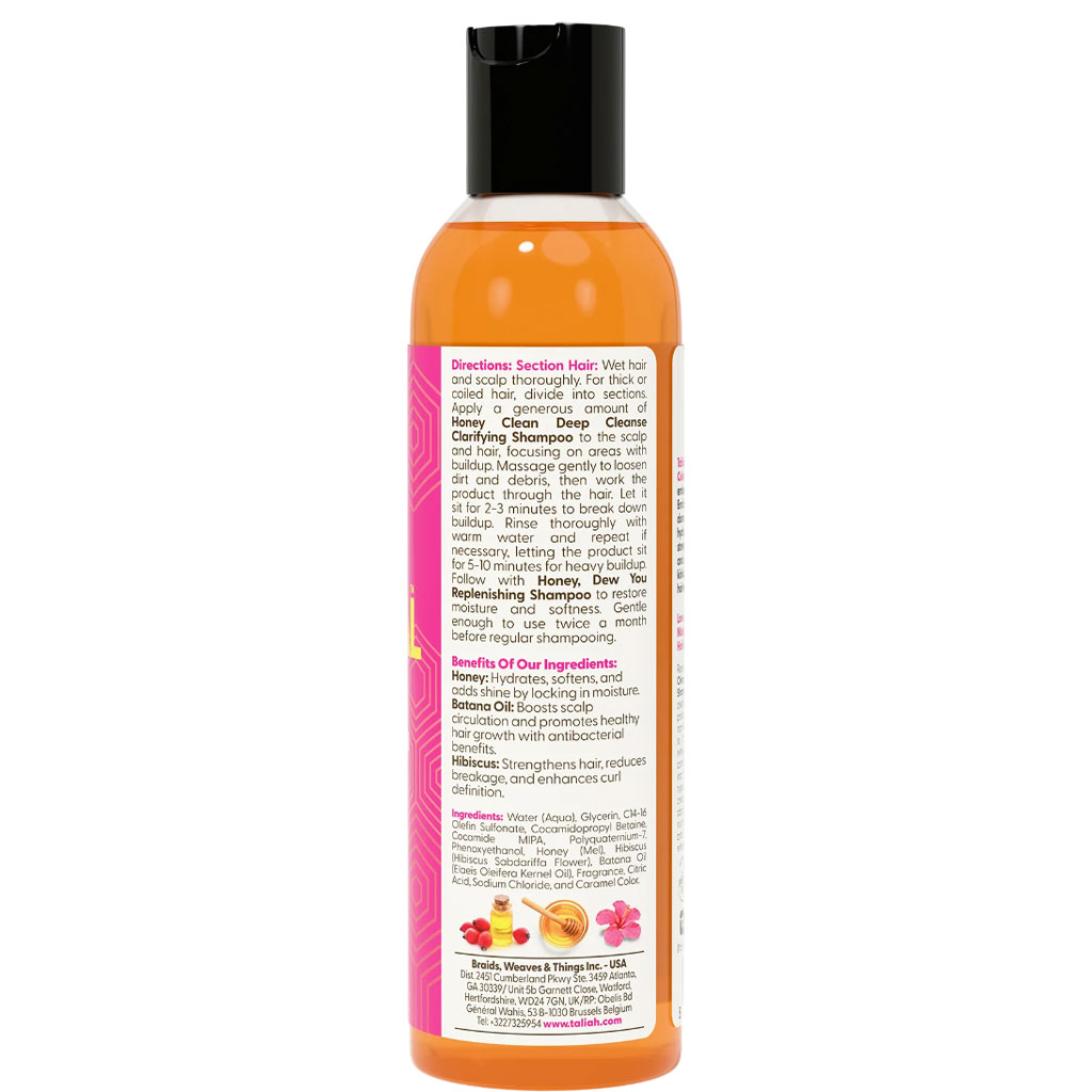 Reset your hair and scalp with Honey Clean Deep Cleanse Clarifying Shampoo, designed to thoroughly cleanse and remove buildup from product use, dirt, and debris. This non-drying formula deeply penetrates to lift away impurities, leaving hair refreshed, light, and ready to receive conditioning, moisturizing and nutrients into the hair strands. Perfect for all hair types, this deep cleansing shampoo creates a clean slate for better product absorption and healthier hair care routines. Use regularly to keep your hair and scalp feeling clean, light, and refreshed.