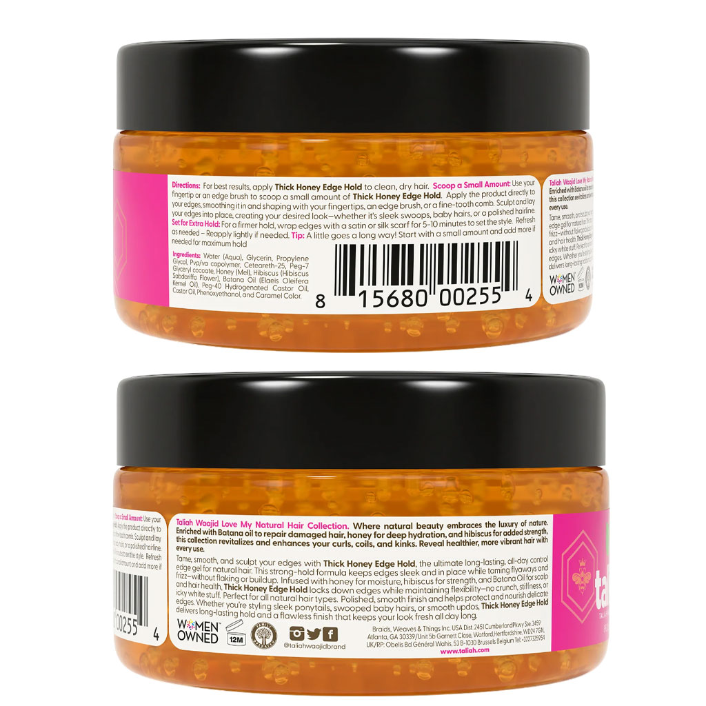 Tame, smooth, and sculpt your edges with Thick Honey Edge Hold, the ultimate long-lasting, all-day control edge gel for natural hair. This strong-hold formula keeps edges sleek and in place while taming flyaways and frizz—without flaking or buildup. Infused with honey for moisture, hibiscus for strength, and Batana Oil for scalp and hair health, Thick Honey Edge Hold locks down edges while maintaining flexibility—no crunch, stiffness, or icky white stuff. Perfect for all natural hair types. Polished, smooth finish and helps protect and nourish delicate edges. Whether you’re styling sleek ponytails, swooped baby hairs, or smooth updos, Thick Honey Edge Hold delivers long-lasting hold and a flawless finish that keeps your look fresh all day long.