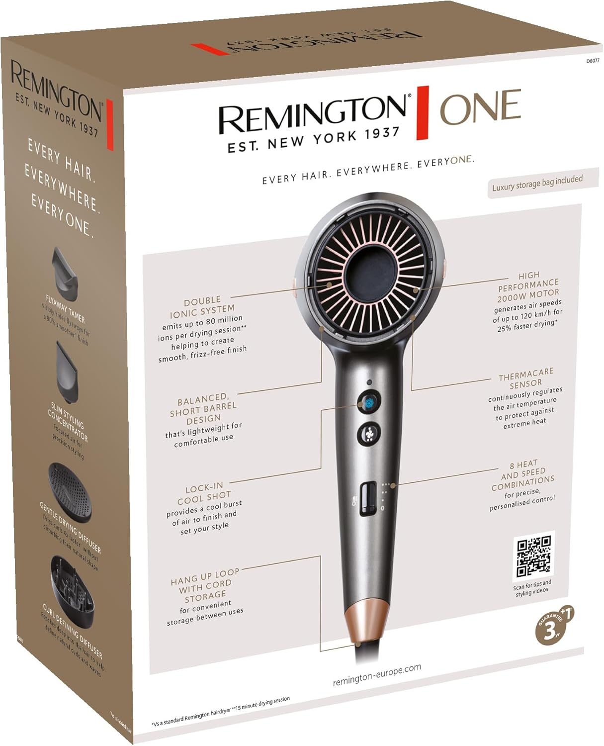 The Remington ONE Dry & Style Hairdryer is a fast, powerful, and versatile styling tool designed to deliver professional results at home. Powered by a 2,000-watt motor and an impressive 120 km/h airflow, it dries hair up to 25% faster while helping to reduce frizz and flyaways. Featuring advanced heat protection technology, dual ion generation, and multiple styling attachments, this hairdryer is ideal for smooth, sleek styles or beautifully defined curls—all with comfort and control.