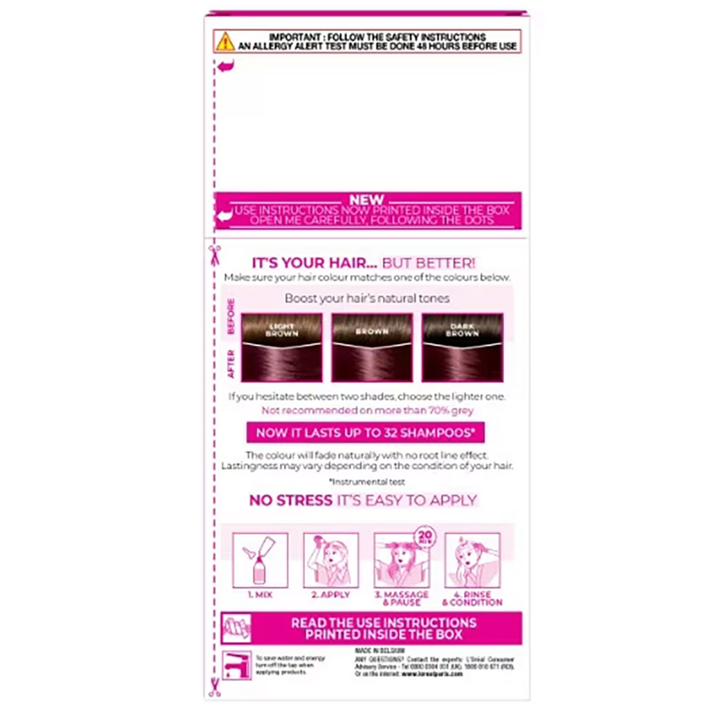 Introducing new formula with 10% Glycolic Gloss Complex for glossy, intensely conditioned & low-commitment colour.Enjoy up to 3x more gloss, up to 4x silkier and visibly healthier hair for up to 32 shampoos. Follow packet instructions and do a patch test 48 hours before use, Mix color and developer wearing gloves, Apply mixture and leave on as directed, Condition and rinse.Ammonia-free conditioning colour for gentle, vibrant results
