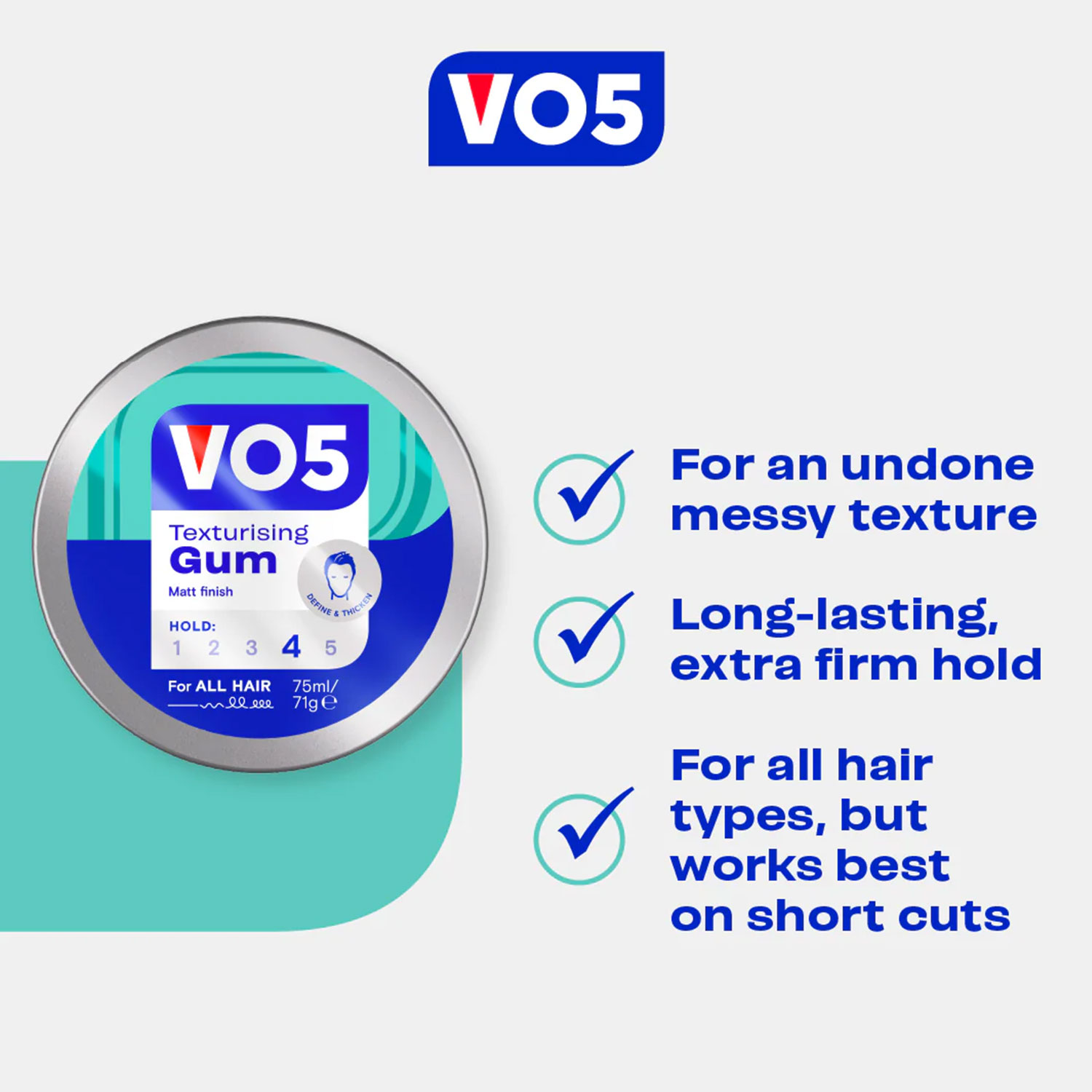 VO5 Extreme Style Texturising Gum to sculpt and define any style. Ideal to sculpt and create any style. Ideal for texturising, separating or smoothing. Great for scrunching into curls. Long lasting extra firm hold.