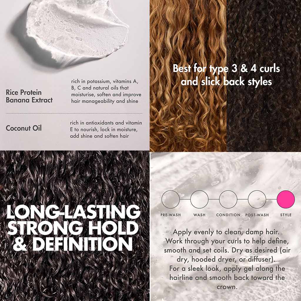 The gel-like texture glides smoothly through your hair and provides a strong hold, perfect for slick-back styles or keeping your curls perfectly in place. It tames frizz, adds shine, and makes your hair super manageable. Ideal for dry, frizzy curls & coils in need of extra love.
