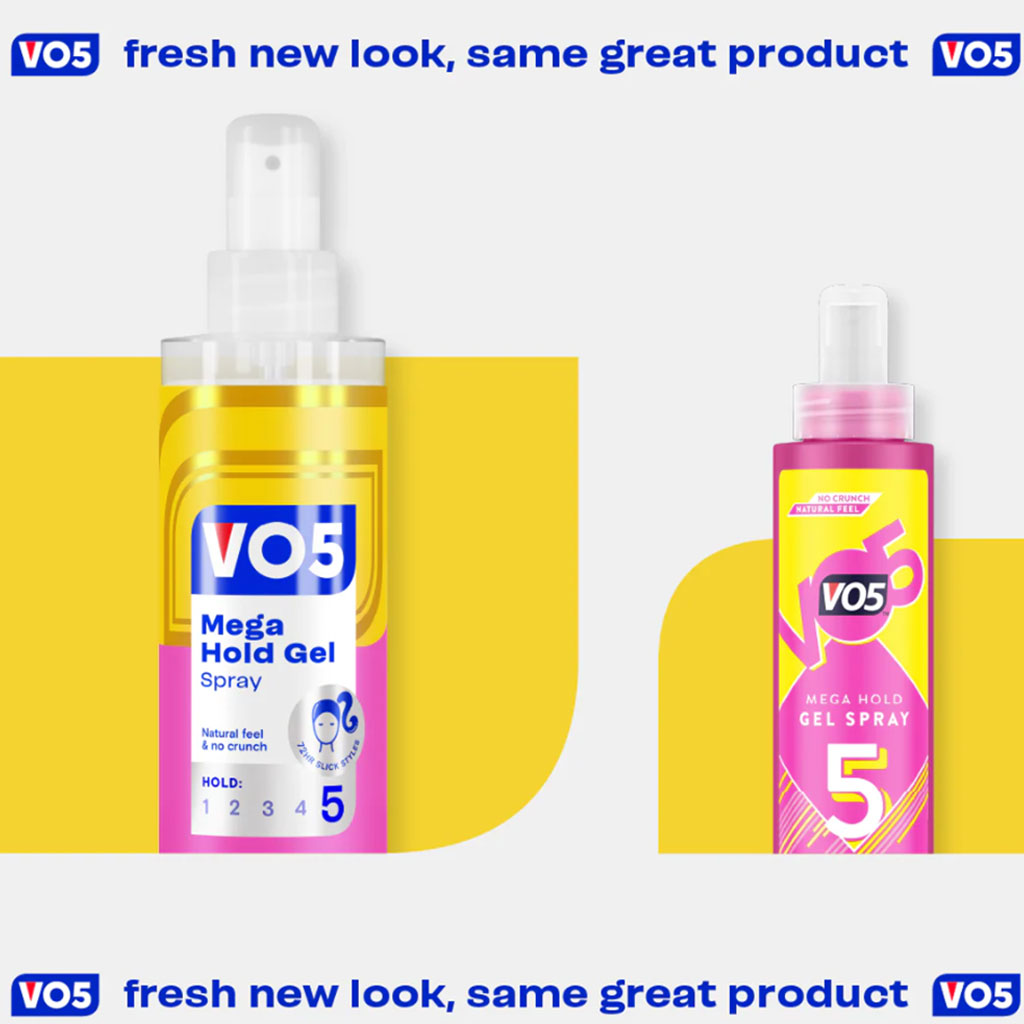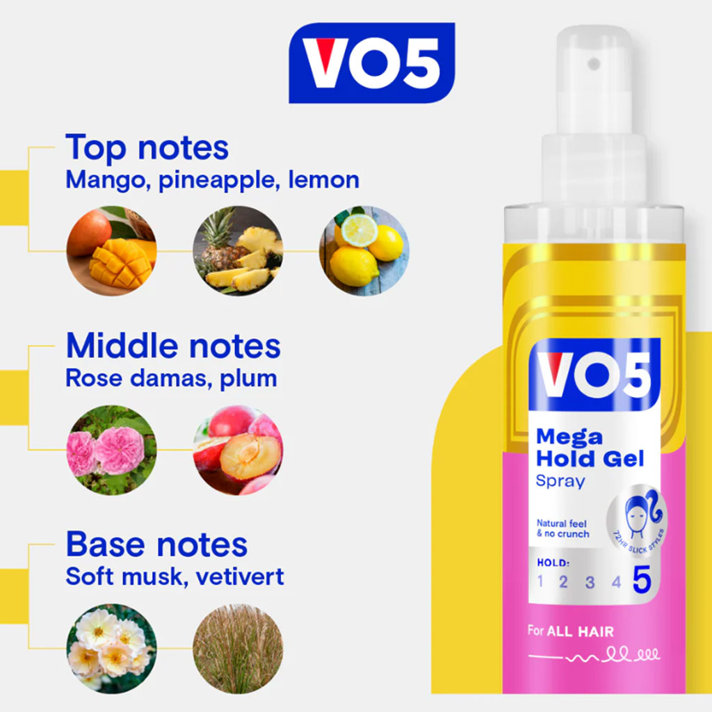 Get the hold of a gel with the convenience of a spray with VO5 Mega Hold Gel Spray. The lightweight, fine mist formula provides 72 hours of sleek slick back styles, without any sticky residue or crunch. Enjoy all-day style control without the frizz, we’ve got you covered from.
