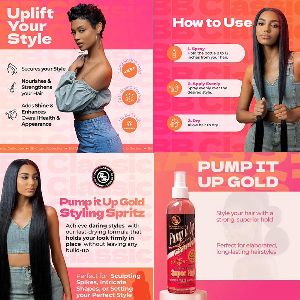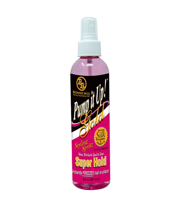 Pump it Up® Super ® Hold Gold does just what the name says. Super Hold Gold dries quickly leaving your hair exactly as you shape, spike, sculpt, scrunch, style, wave, or design it.