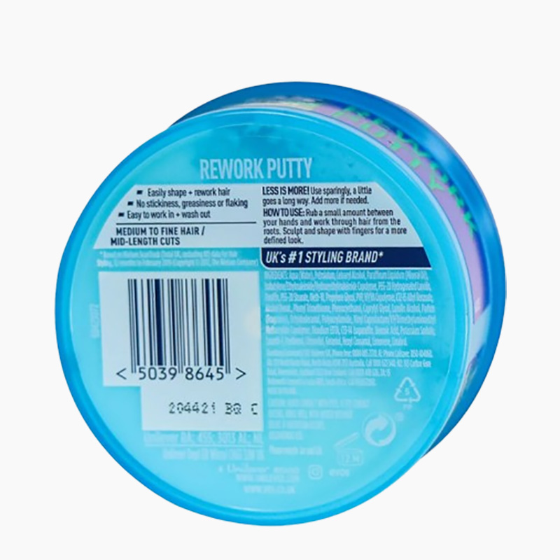 VO5 Rework Hair Putty offers all day reworkable hold and is ideal for creating natural styles with messy texture. VO5's Rework Putty is great for short to mid length cuts. Ideal to manipulate your hair in any direction. Easy to work in and wash out, with no stickiness, greasiness or flaking.