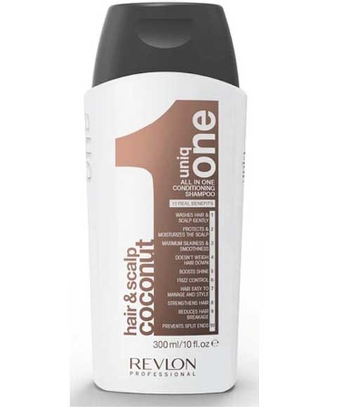 Uniq One Coconut All In One Conditioning Shampoo is an innovative hair and scalp cleanser for all hair types. Experience its fresh coconut fragrance with hints of toasted hazelnut and vanilla Offering 10 unique hair care benefits in one luxurious formula, All In One Conditioning Shampoo protects and moisturises the scalp whilst strengthening the hair to reduce breakage and prevent split ends. Providing the hair with maximum silkiness and smoothness, this revolutionary shampoo and conditioner won’t weigh the hair down and works to boost shine and combat frizz. Sure to become a hair care staple, All In One Conditioning Shampoo leaves the hair easier to style with improved manageability, noticeable improvement in health and radiating in a glossy, lustrous shine.