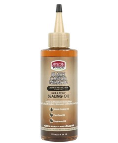 African Pride Black Castor Miracle Hair and Scalp Sealing Oil is specially crafted with a blend of Black Castor Oil, Tea Tree Oil and Soybean Oil to lock moisture into hair strands and improve moisture retention. Helps to condition hair, soothe scalp, calm itching and prevent dryness. Great for braids, crochets, edges, under weave care and protective styles.