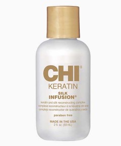 CHI Keratin Silk Infusion Keratin and Silk Reconstructive Complex Powerful reconstructing complex that heals and hydrates dry, damaged hair. While natural keratin rebuilds the hairs cuticle, silk penetrates deep into the hair to retain moisture and smooth the cuticle.