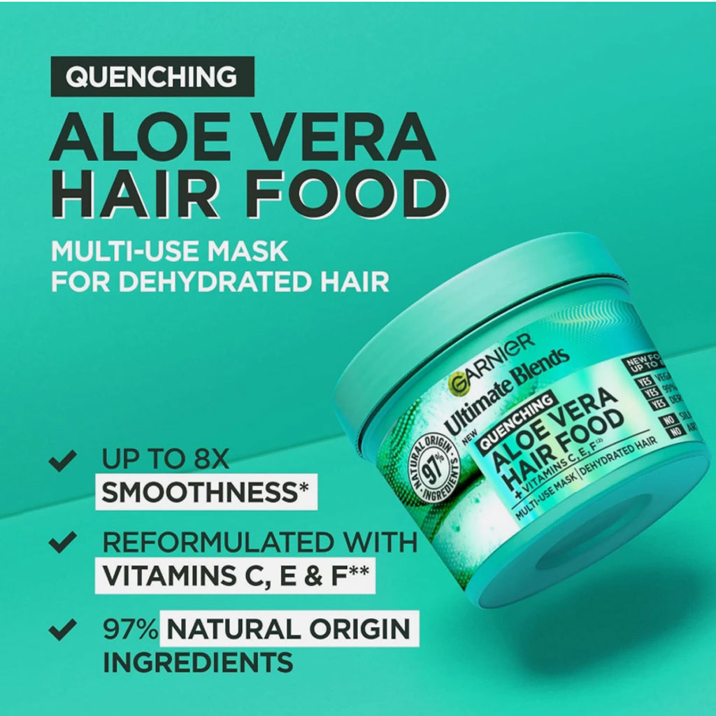 Nourish your hair with the Garnier Ultimate Blends Hair Food Aloe Vera 3-in-1 Normal Hair Mask Treatment. This hydrating hair mask is infused with Aloe Vera and Coconut to leave your tresses feeling silky soft and smooth. Your hair will appear up to four times shinier, thanks to a blend of 98% natural ingredients. The multi-use hair treatment can be used as a conditioner, mask or leave-in treatment. This replenishing Vegan formula is free from silicone to leave your hair feeling smooth without weighing it down. The formula is also 98% Biodegradable.