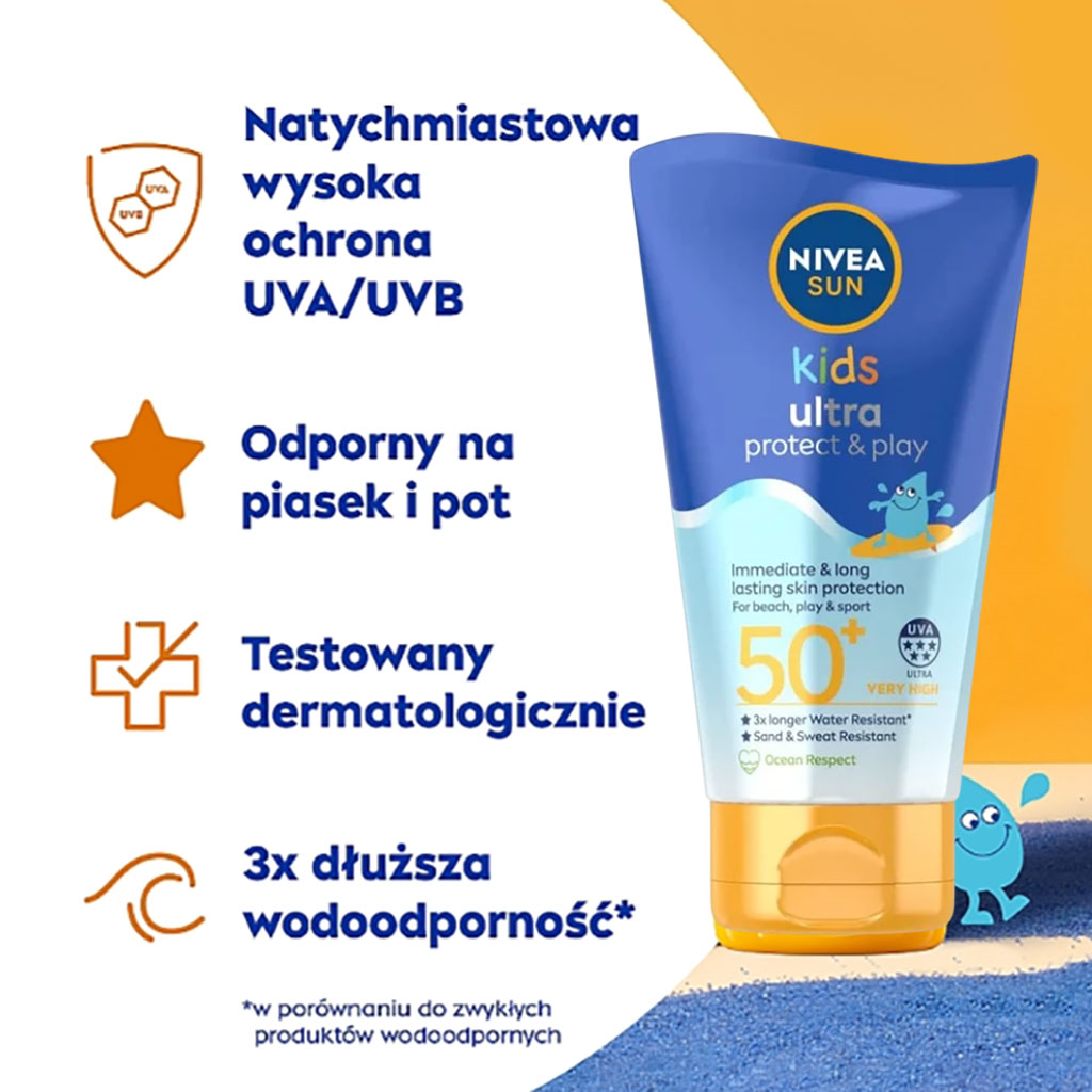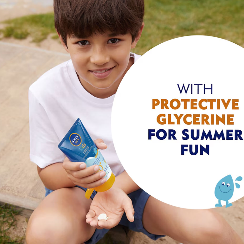Nivea Sun Kids Ultra Protect & Play Sun Cream SPF50+ (150ml) provides immediate, long-lasting and very high sunscreen protection for children's delicate skin for beach, play and sport. With its skin compatibility paediatrician approved, this sun cream 3 times more water-resistant than regular sunscreen and is resistant to sweat and sand. The 76% biodegradable formula includes Dexpanthenol to assist the skin's natural protective barrier and provide instant, long-lasting water resistance. Suitable for use on children's delicate skin, aged 3 years and above.