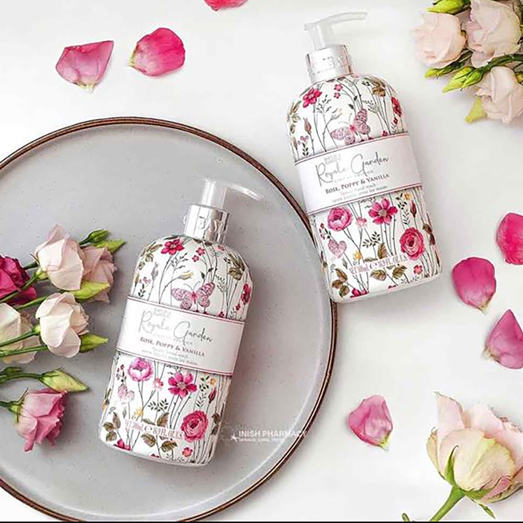 Royale Garden Rose, Poppy & Vanilla Hand Wash is a luxurious hand wash Limited Edition with a floral scent of rose, poppy and vanilla. Perfect to place on the counter or by the sink in the bathroom.