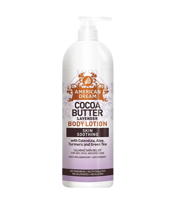 American Dream Cocoa Butter Lavender Body Lotion, an all over body lotion to massage into dry to extra dry skin. Restores balance to the skin's barrier to lock in moisture.