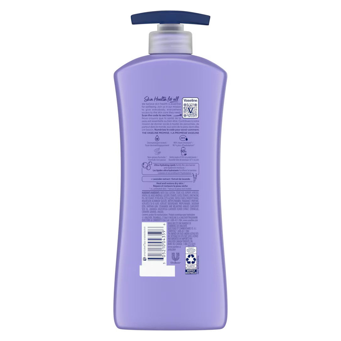 Vaseline® Intensive Care⢠Calm Healing Body Lotion is specially formulated to heal and restore dry skin while providing a calming, relaxing experience. Enriched with Lavender Extract and ultra-hydrating lipids, this fast-absorbing lotion strengthens the skin barrier, replenishes moisture, and leaves skin looking healthy and feeling soft. Ideal for daily use, it delivers long-lasting hydration without a greasy residue.