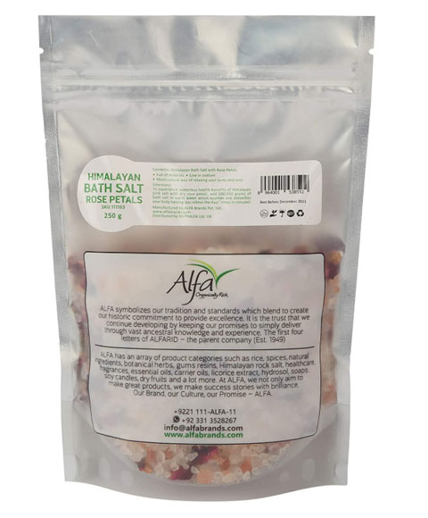 Alfa Himalayan Bath Salt with Rose Petals will give you a divine and refreshing bathing experience. It is the most natural way of relaxing the body and soul. It is used in bathing and spa. It acts as a natural healer and releases stress through scrubbing. It reduces signs of aging and regulates sleep cycle. It also improves body hydration. It is available in a resealable pouch, which helps maintain goodness.